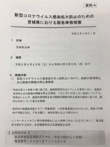 でした、村井知事より休業要請を行う業種に関して発表がありましたので添付させて頂きます。