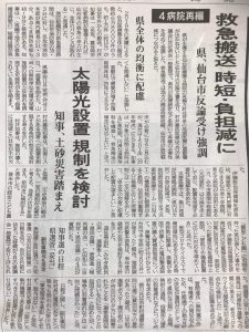 昨日一般質問に立たせて頂きました。取り上げました4病院再編、太陽光設置規制、豊里こども園襲撃事件、特殊詐欺対策について河北新報社、読売新聞社に掲載頂きました、今後とも務めて参ります。